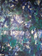 J’aime travailler la transparence des couleurs, poussée par mon obsession de créer des jeux de lumière et de profondeur. Je suis en recherche constante sur le travail de la matière et n’utilise plus les pinceaux depuis très longtemps. Après une série de travaux exclusivement avec des éponges, et d’autres avec le couteau, désormais mes seuls outils pour peindre sont des louches et bols en calebasse ramenés du Burkina Faso avec lesquels je déverse mes préparations de pigments et d’encres sur la toile posée au sol.